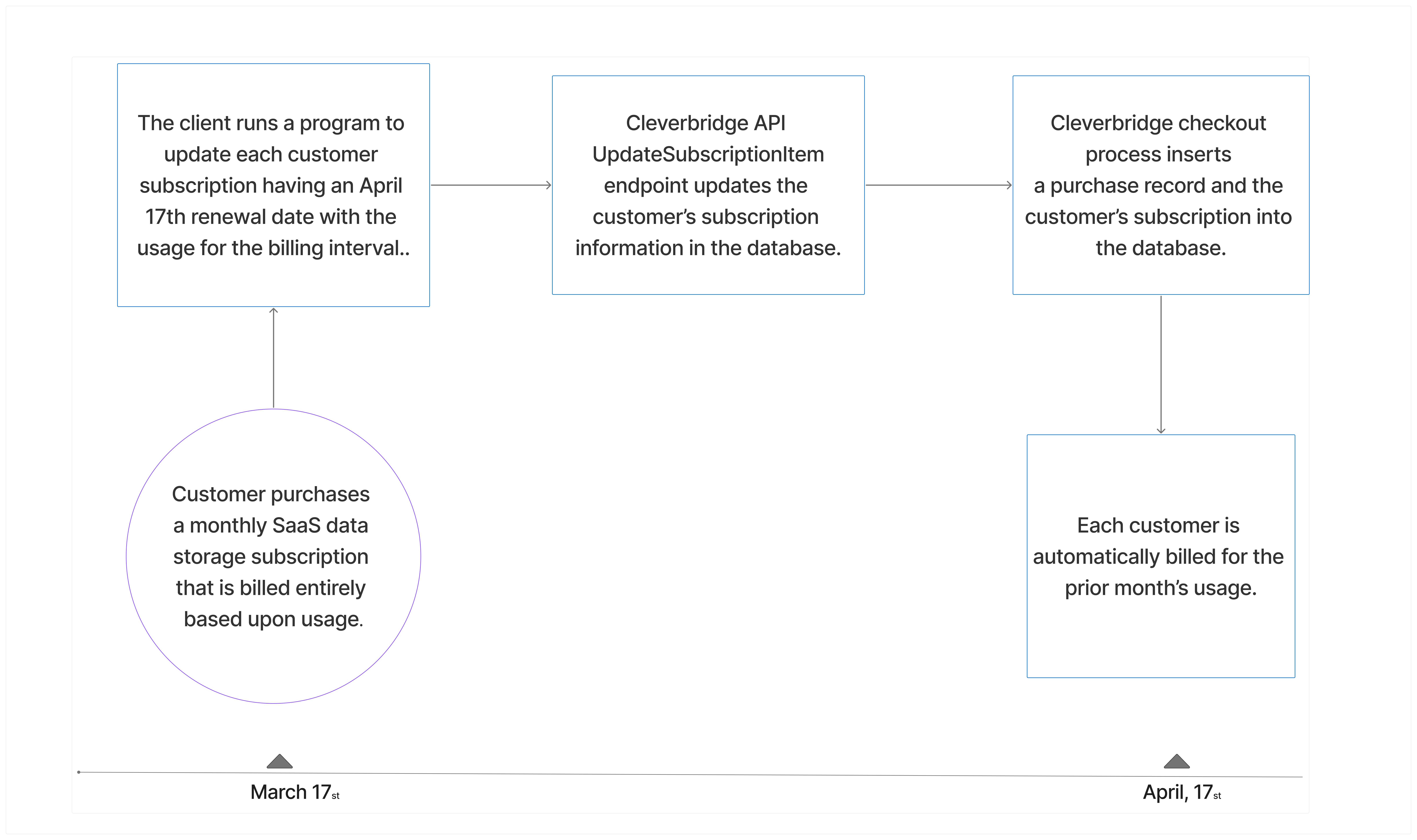 - On April 17th, the Cleverbridge platform automatically bills each customer for the prior month's usage.