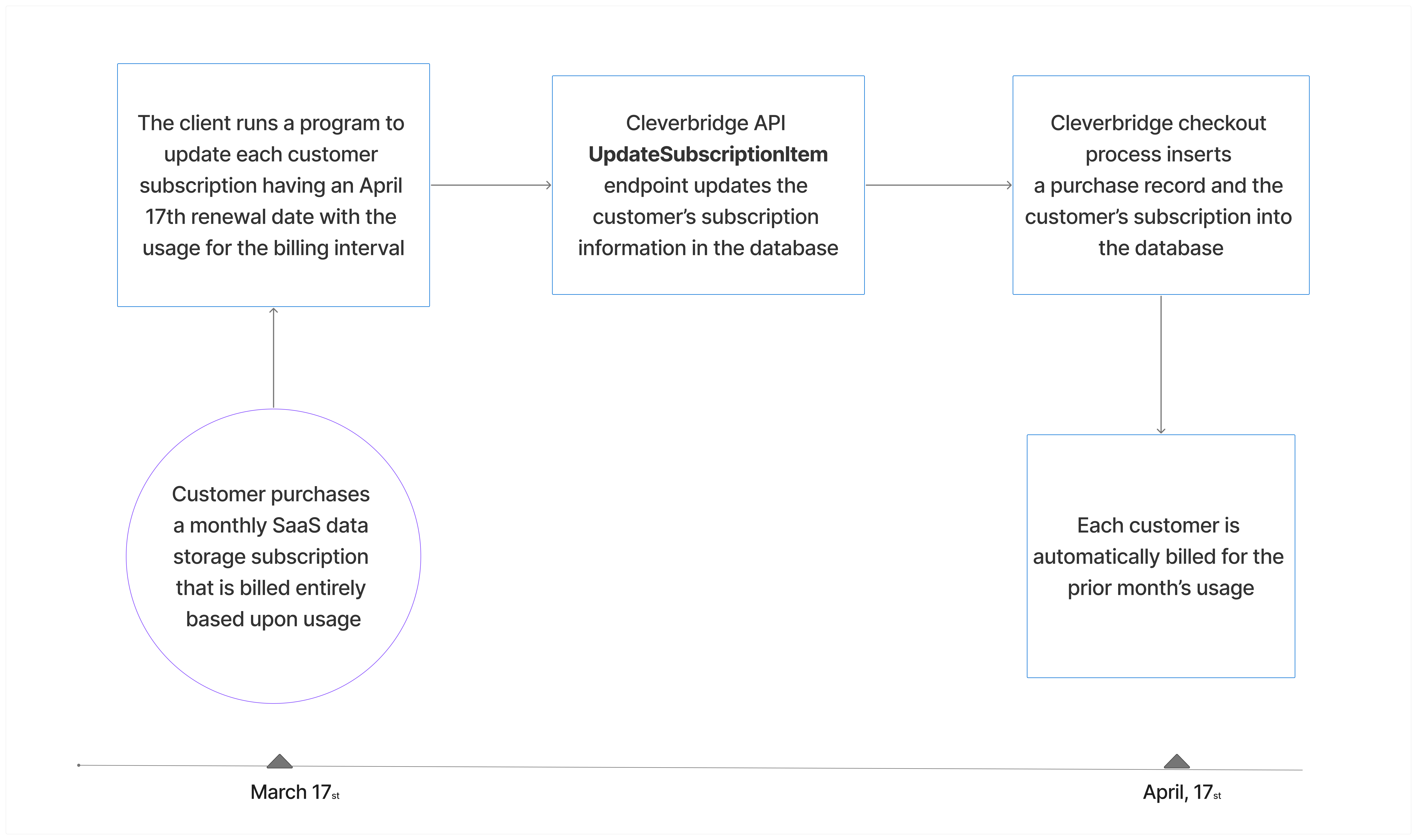 - At the end of the day on April 16th, you use a program that accesses the Update Subscription Item endpoint to update the usage quantity for the monthly billing interval that just ended. This program calculates usage for each subscription with a renewal date of April 17th.