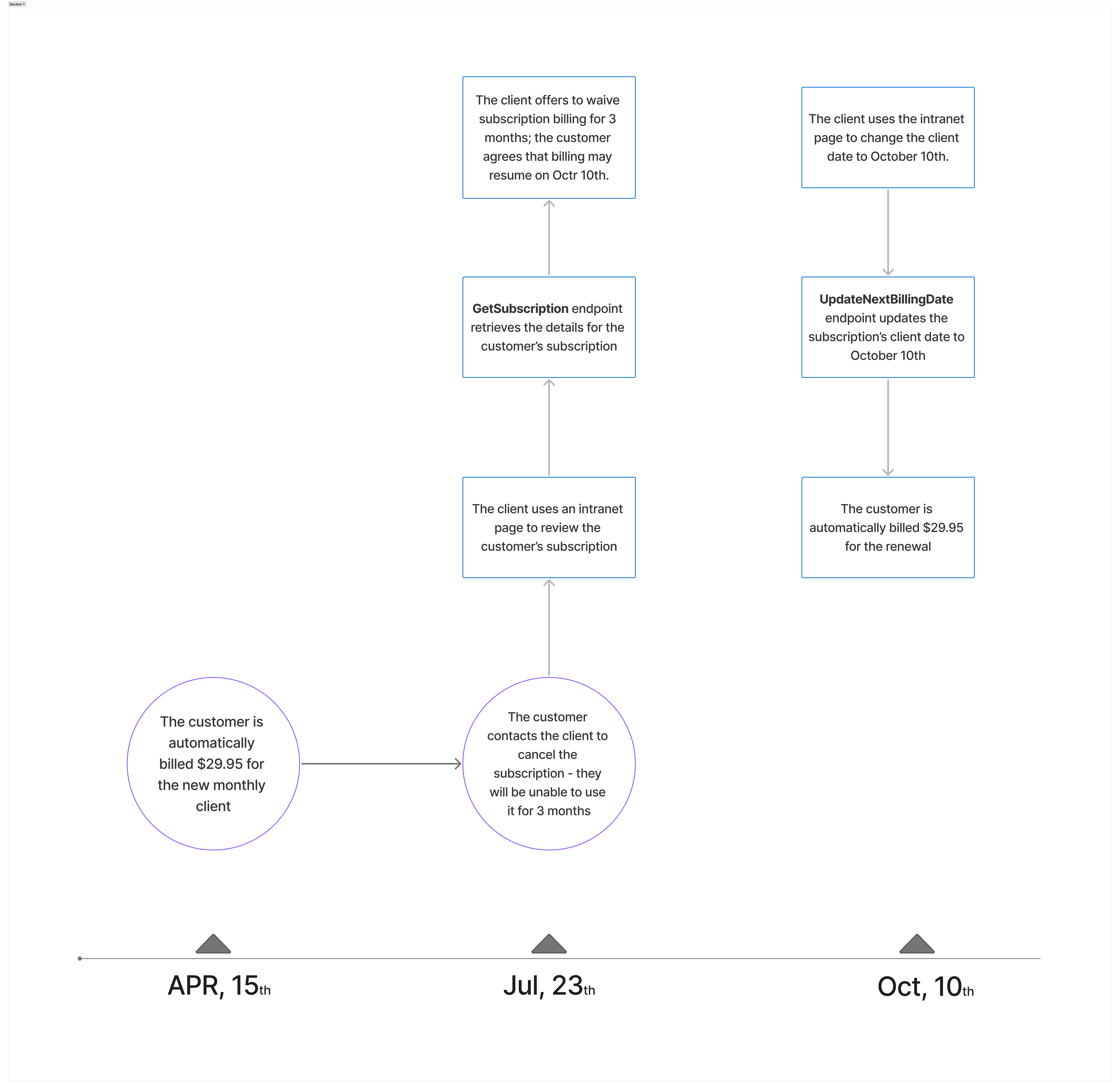 - The customer service representative sets the next billing date to October 10th using an intranet page that uses the Update Next Billing Date API endpoint.